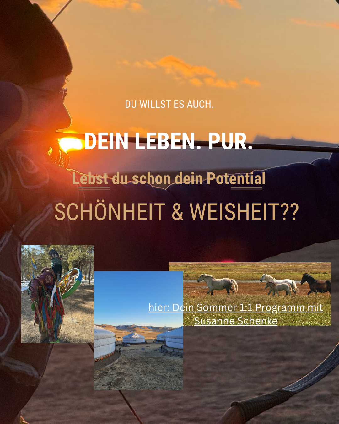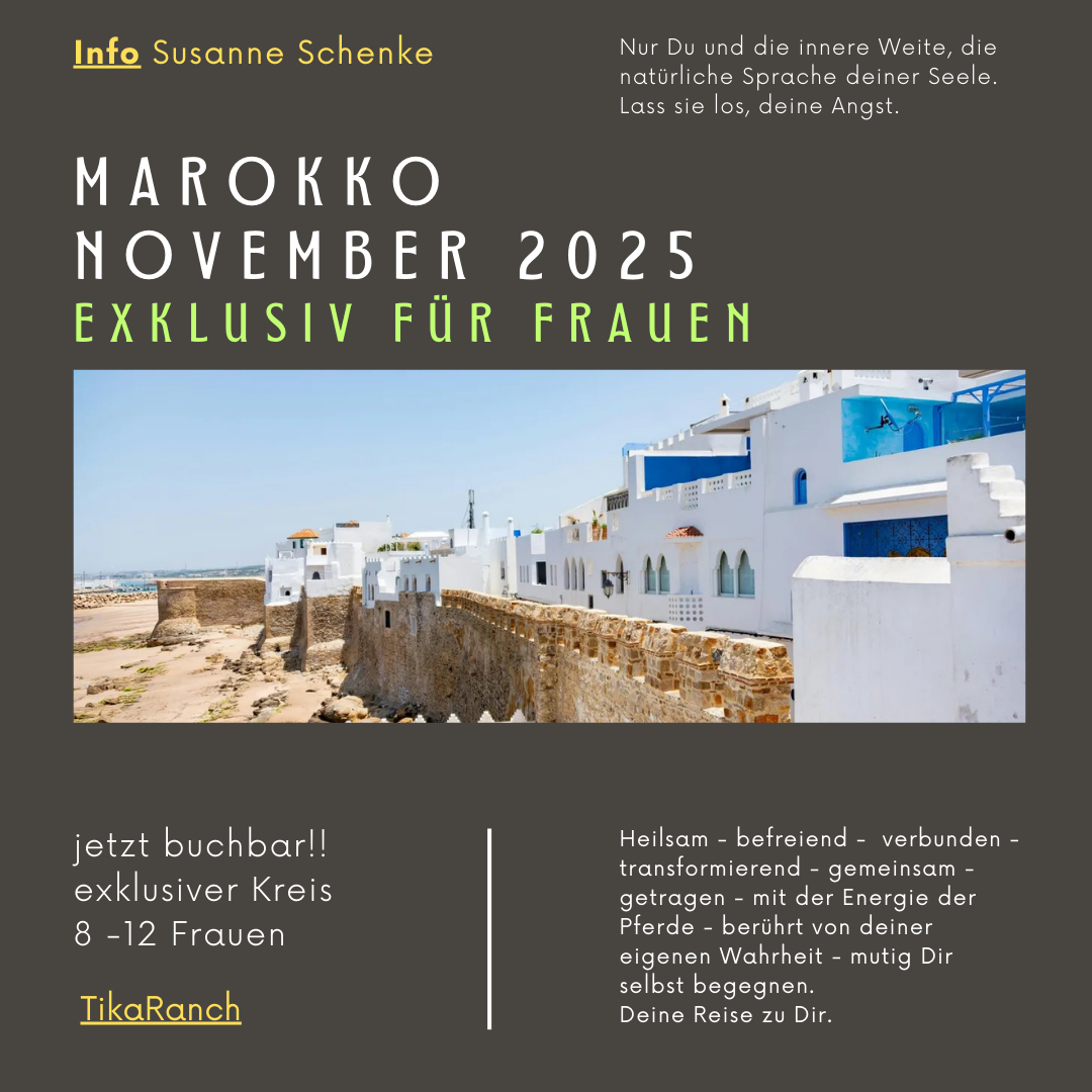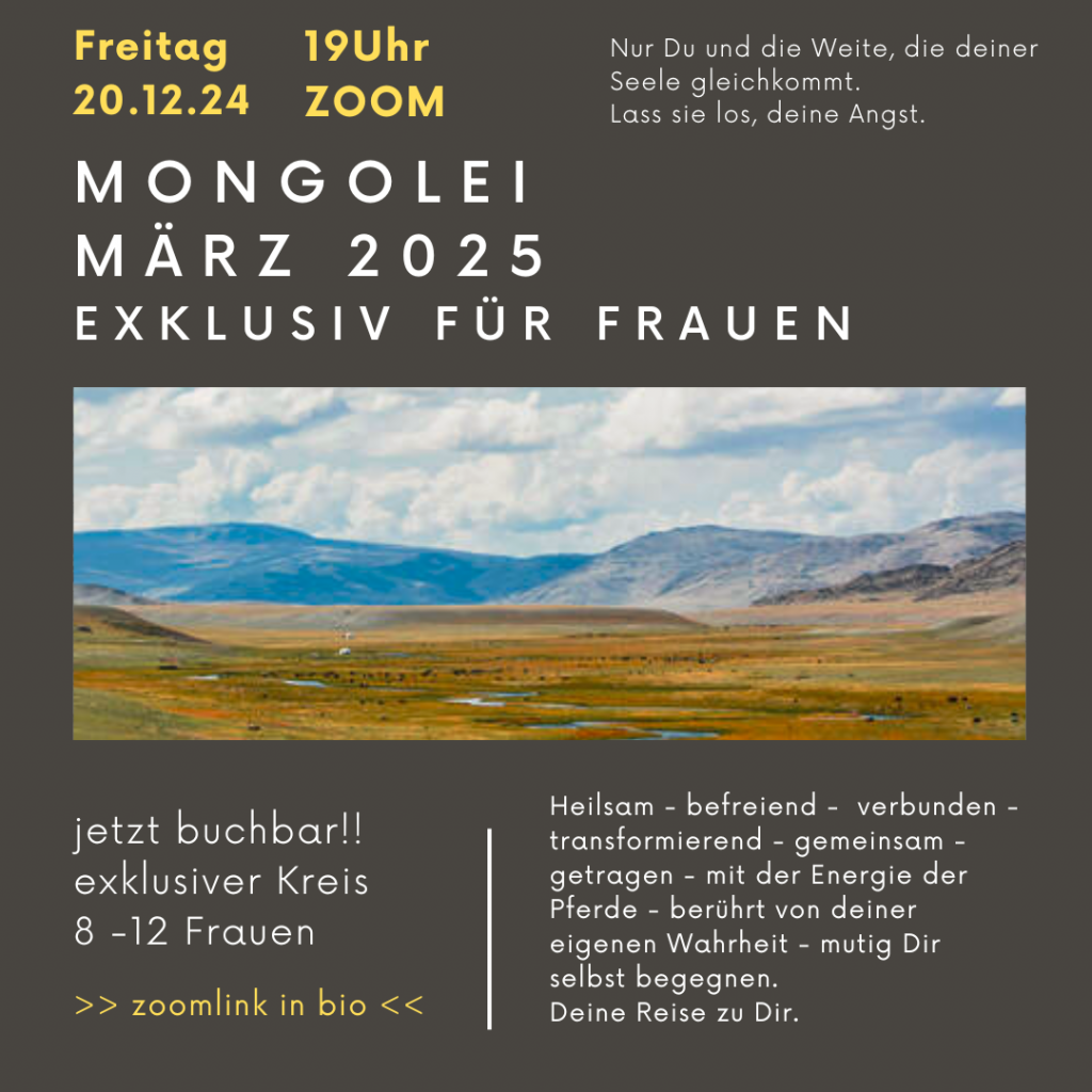 - Du kannst Teil sein in meinem Retreat – Programm, erlebe DAS ABENTEUER EINES LEBENS – intensiv – transformierend – ehrlich – einzigartig – geführt zu Dir selbst, zu deiner Wahrheit auf der Reise deines Lebens in die Weite Mongolei oder den Urspung Marokko – triff Nomaden, Heiler, Pferde – und Dich selbst.